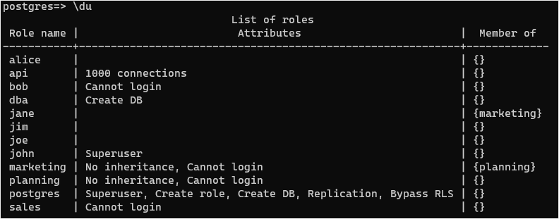 Second, use the \du to list all user accounts (or roles) in the current PostgreSQL database server: