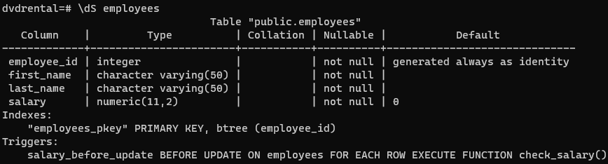 Finally, use the ALTER TRIGGER statement to rename the before_update_salary trigger to salary_before_update: